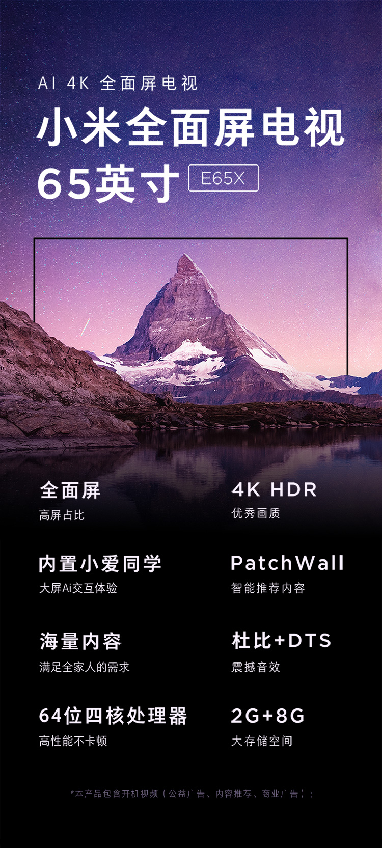 商品名稱:小米(MI)電視E65X 65英寸 全面屏 4K超高清HDR 藍牙遙控內(nèi)置小愛 2 8GB AI人工智能液晶網(wǎng)絡平板電視 L65M5-EA