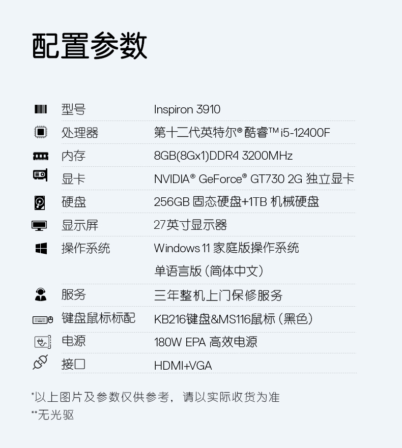 商品名稱:戴爾DELL靈越3910 家用辦公電腦 商務(wù)臺式機電腦主機(12代i5-12400F 8G 256G+1T 2G獨顯 )27英寸整機