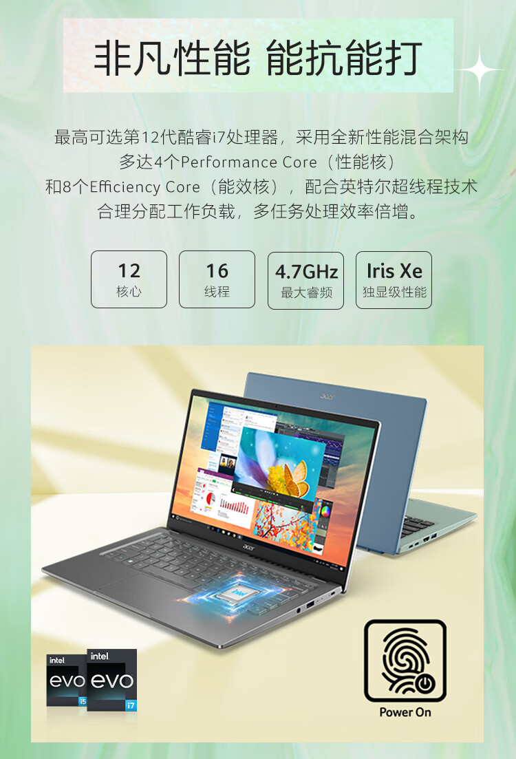 自營(yíng)宏碁(Acer)非凡S3 全新12核Evo超能輕薄本 14英寸2.5K高色域 辦公學(xué)生筆記本電腦(12代i5-1240P 16G 512G)銀