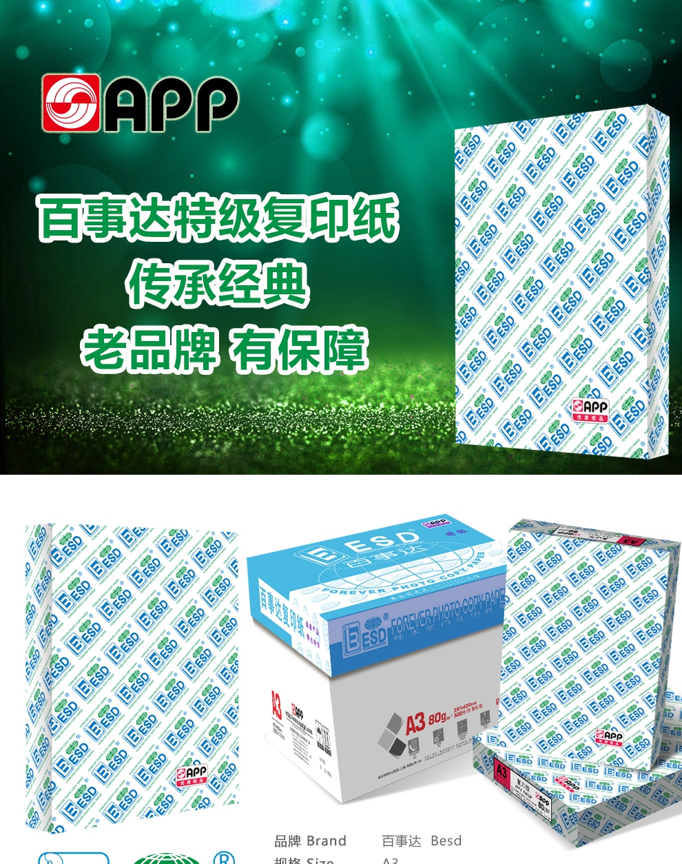 商品名稱:金光(APP)藍色百事達(Besd)A3/80g 復(fù)印紙 500張/包 5包/箱(2500張)