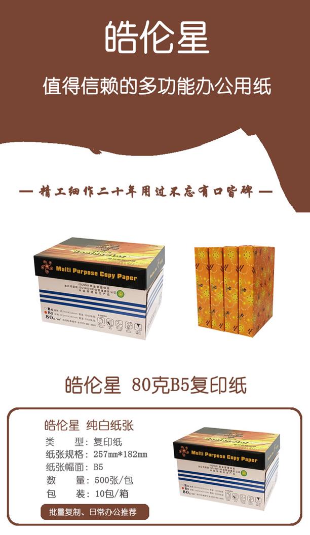 商品名稱:皓倫星 80克B5 復印紙 10包/箱 500張/包(單價 元/箱)廠家直銷
