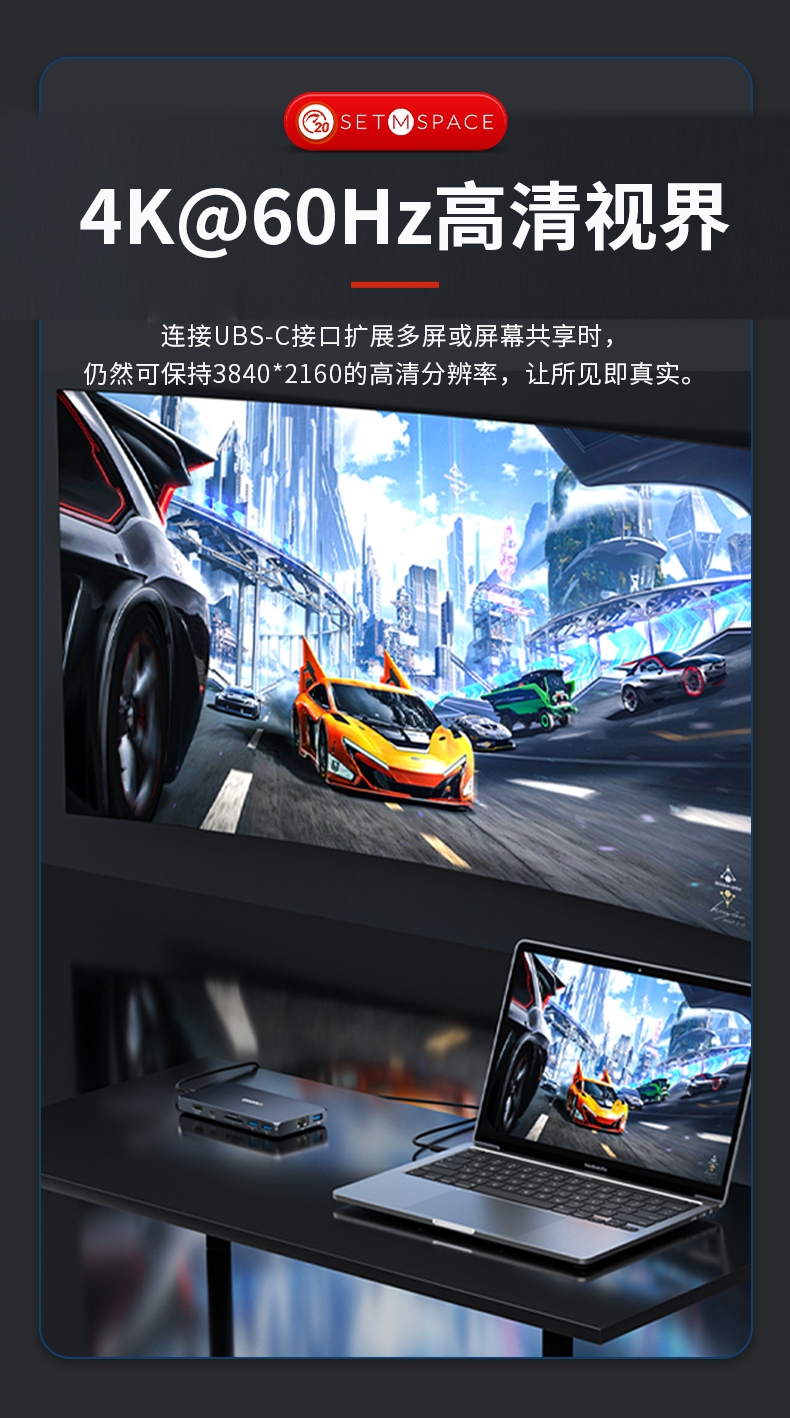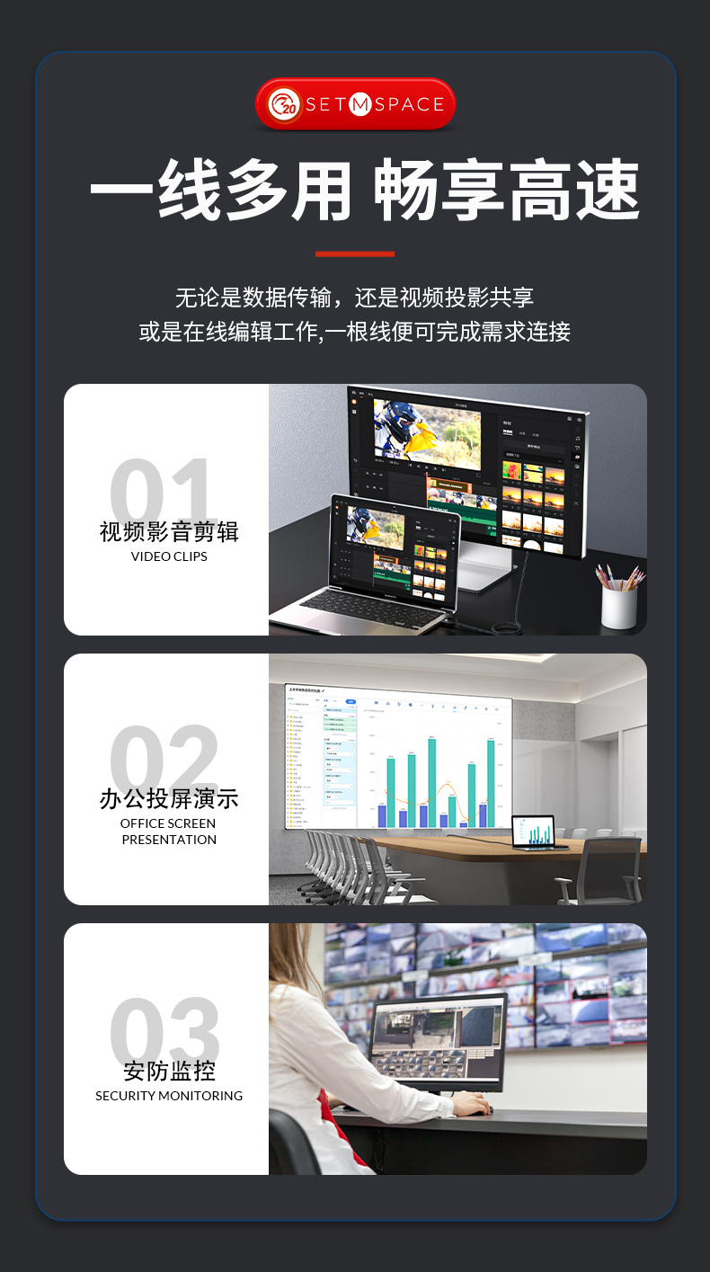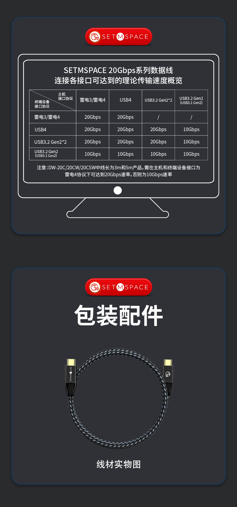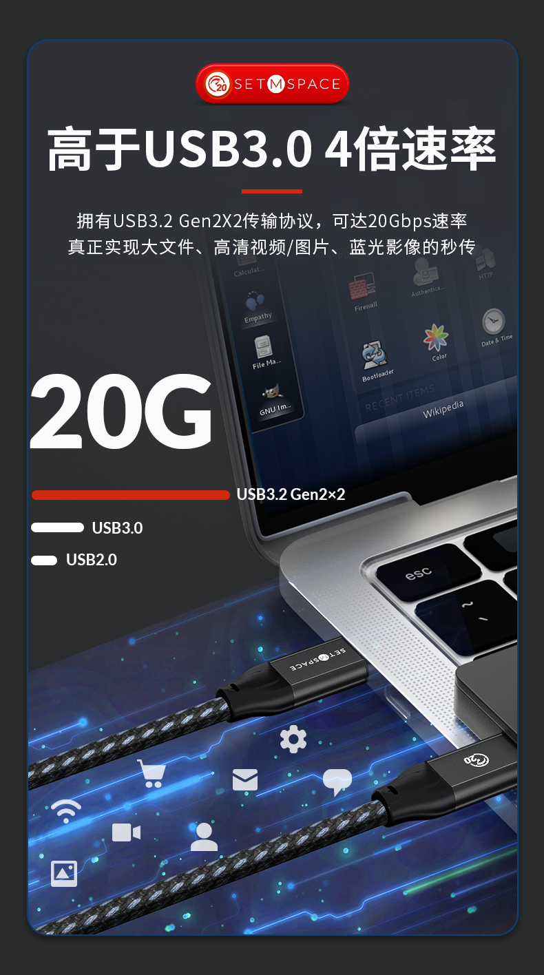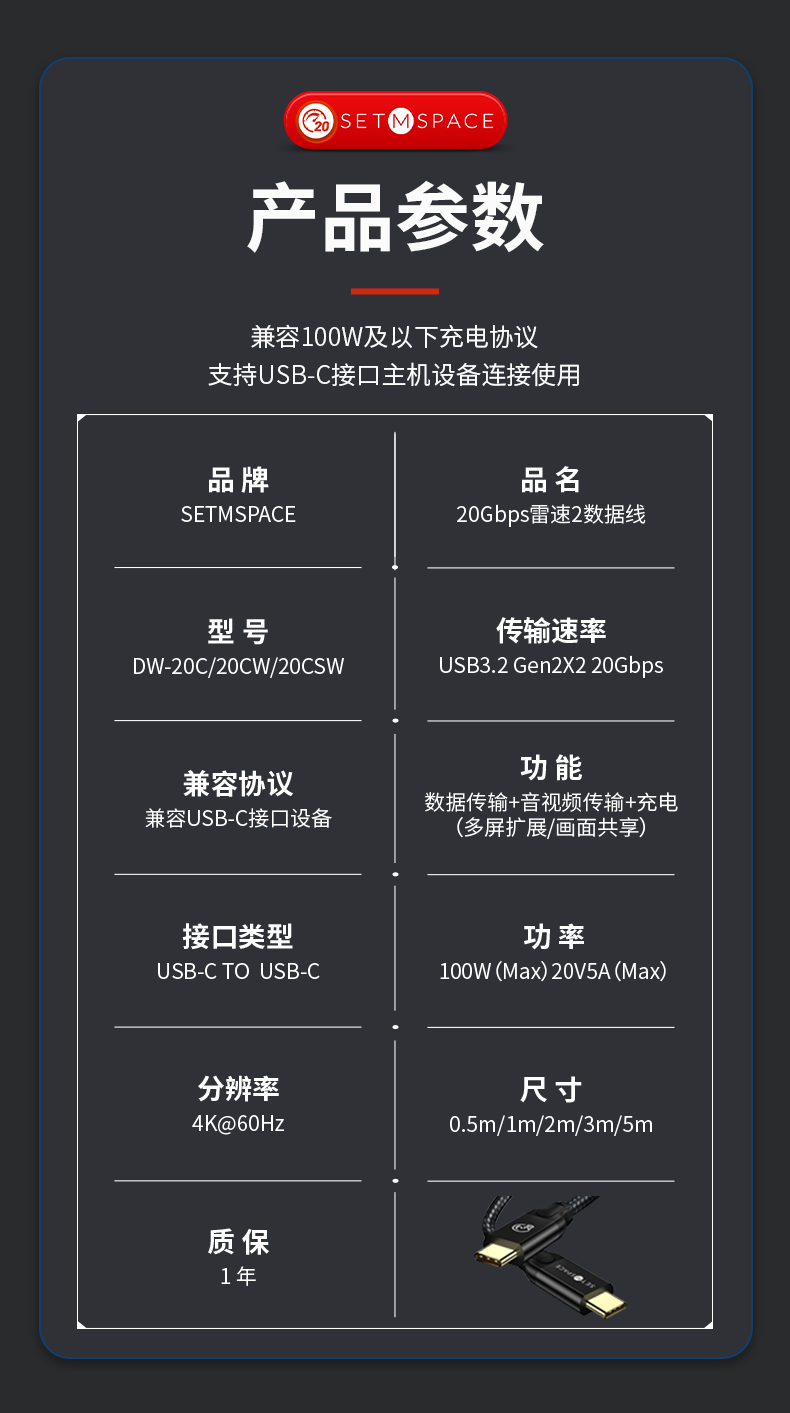 商品名稱:SETMSPACE (合金桌面)USB3.2Gen2*2全功能type-c數(shù)據(jù)線顯示器視頻連接線快充 20Gbps USB3.2 C直-C直 線長0.5m