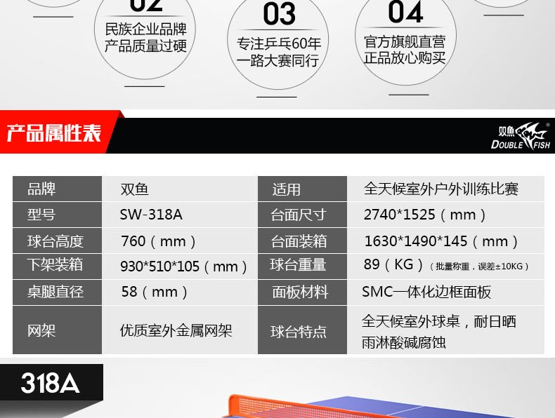 商品名稱:雙魚室外318A標準乒乓球臺防水戶外露天乒乓球