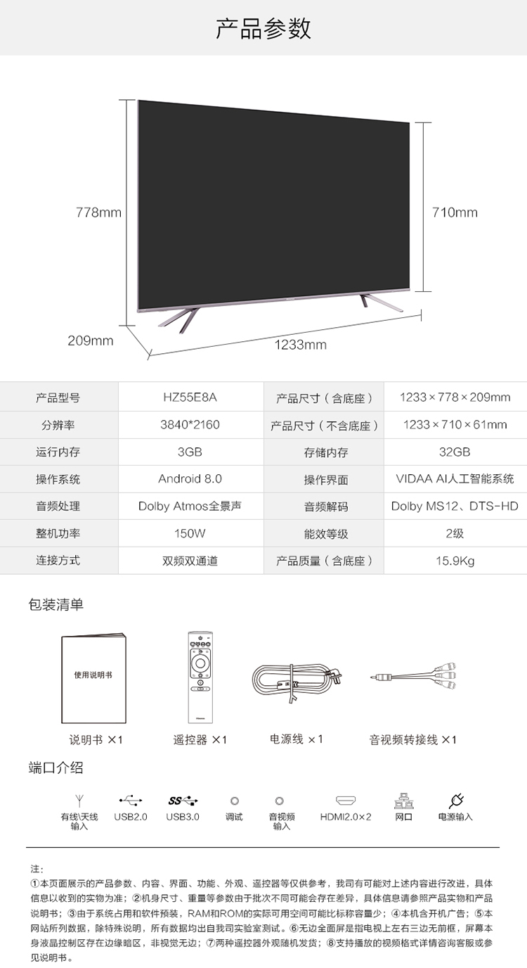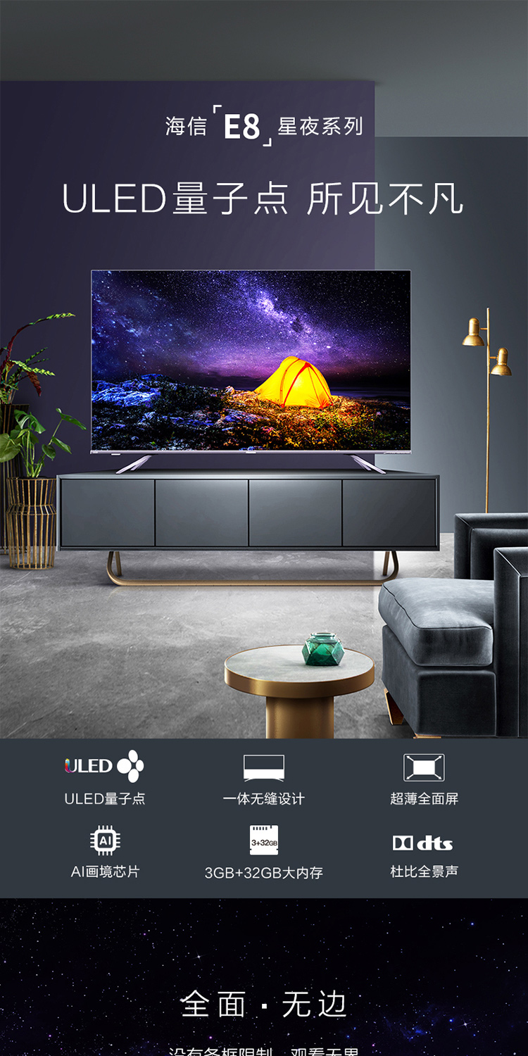 商品名稱:海信(Hisense)HZ55E8A 55英寸 4K ULED超畫質(zhì) 量子點 超薄全面屏 AI人工智能液晶電視機