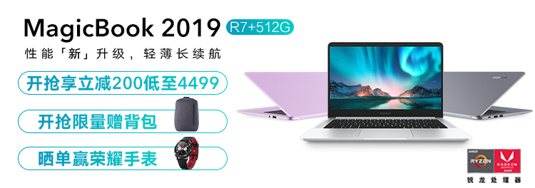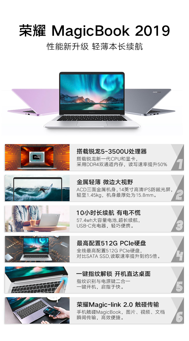 自營榮耀MagicBook 2019 14英寸輕薄窄邊框筆記本電腦(AMD銳龍5 3500U 8G 512G FHD IPS 指紋解鎖)冰河銀
