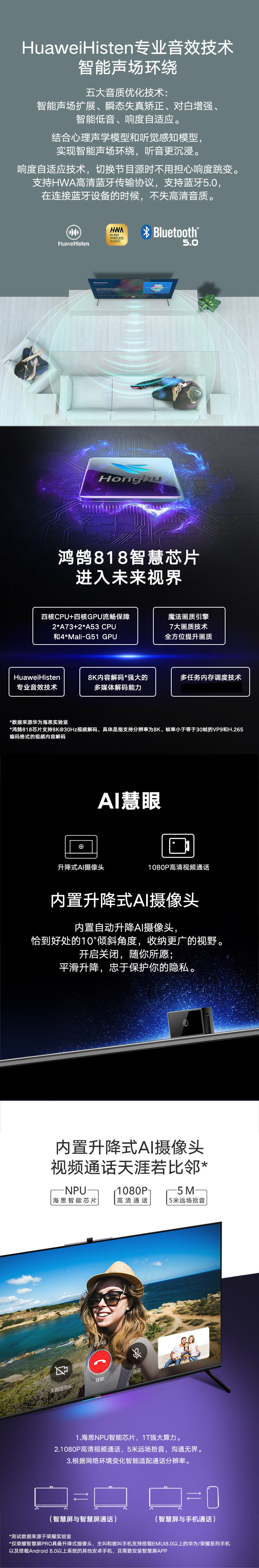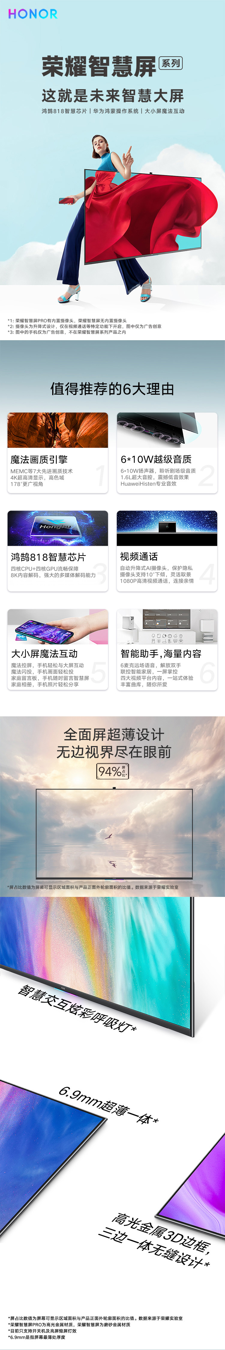 商品名稱:榮耀智慧屏Pro 55英寸 2G+32G 視頻通話 遠場語音 4K超高清 人工智能液晶電視 華為超薄金屬全面屏OSCA-550
